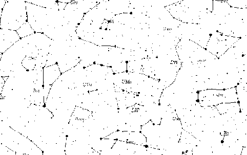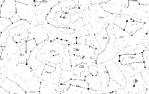 Контурная карта созвездий Большой медведицы, Малой медведицы, Дракона, Рыси, Гончих псов, Волос Вероники, Волопаса, Северной короны, Малого льва, Возничего, Близнецов, Рака.