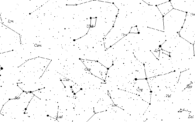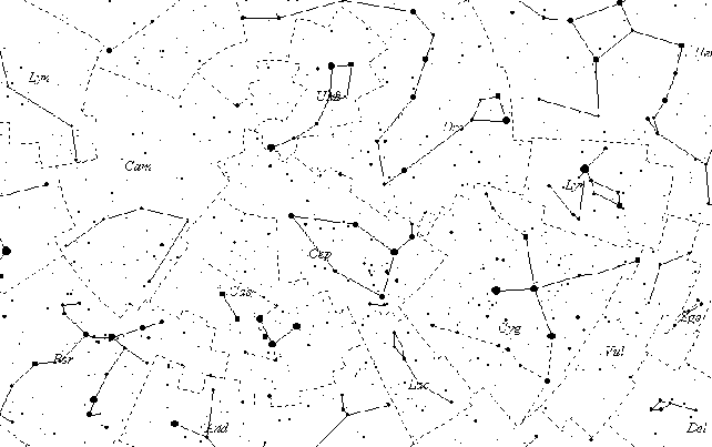 Контурная карта созвездий Цефея, Кассиопеи, Малой медведицы, Дракона, Жирафа, Ящерицы, Лебедя.