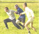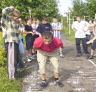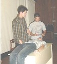 Вопросов было 30, поэтому, чтобы хоть как-то сбить накал страстей, через каждые 5 заданий оглашались ответы, что позволяло играющим командам верно ориентироваться в игровой ситуации. Самой неуравновешенной оказалась команда под названием «Чувяки», выдвинувшая протест против команды преподавателей, не смотря даже на то, что преподаватели участвовали вне конкурса. Тогда Савченко С.В., желая отвергнуть нелепые обвинения, сказал: «Либо мы играем по-честному, либо мы вообще не играем», на что зал разразился бурной овацией. Активной сторонницей честной игры стала команда Hell-law, а вот самым темпераментным участником можно единодушно признать Алексея Латыша. Именно он заметил, что бегунки одной из команд заранее читали вопросы. Бегункам, как всегда, приходилось не сладко, но потом команда Hell-law, столпившаяся в проходе и не дававшая пройти бегункам, решила эту проблему. Один из игроков просто встал на крыльцо, и образовался «ручеек», что значительно облегчило прохождение устремленного к ведущему потока бегунков.
