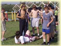Далее мы подобрались к футбольному полю. По пути успели пообщаться с местной братией журналистов. Они пожаловались нам на то, что их не шестеро (как нас), а пятеро, а если быть совсем точным: четверо:-) Так как один мальчик (Вишня Олег) «ничего не делает и постоянно спит». Да и вожатые у них те еще сони.